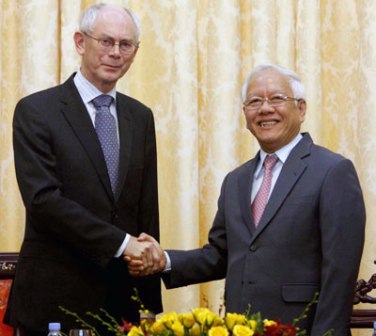 Đáp từ, ông Chủ tịch Hội đồng Châu Âu (EU) Herman Van Rompuy bày tỏ ấn tượng trước sự phát triển năng động của thành phố mang tên vị lãnh tụ vĩ đại của dân tộc Việt Nam. Ông bày tỏ sự ngưỡng mộ trước những nỗ lực của người dân TPHCM nói riêng và đất nước Việt Nam nói chung trong sự nghiêp xây dựng và phát triển đất nước sau thời kì chiến tranh gian khó. Ông khẳng định Việt Nam sẽ tiếp tục là lựa chọn đầu tư của các doanh nghiệp EU và việc ông đến thăm Việt Nam lần này chính là tái khẳng định mối quan hệ tốt đẹp đang trên đà phát triển của hai bên.Việt Nam hiện là đối tác thương mại lớn thứ 5 của EU tại ASEAN và TPHCM chính là đầu tàu kinh tế của Việt Nam, chính vì thế ông tin tưởng trong thời gian đến sẽ có nhiều dự án được triển khai và kí kết tại TPHCM. Đặc biệt, ông khẳng định : EU luôn ủng hộ việc xây dựng một ASEAN hợp nhất, hòa bình, ổn định và ủng hộ giải pháp giải quyết tranh chấp ở Biển Đông trên nguyên tắc và cơ sở luật pháp quốc tế.